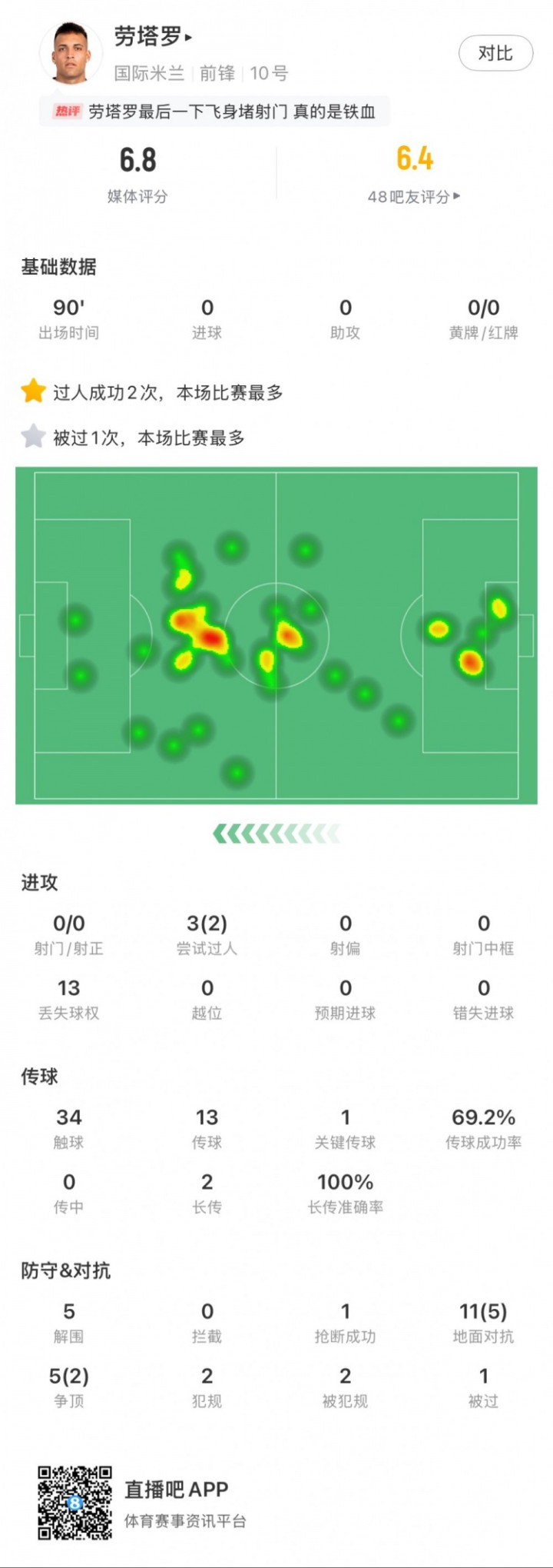劳塔罗本场数据: 0次射门, 16次对抗赢得7次, 5次解围